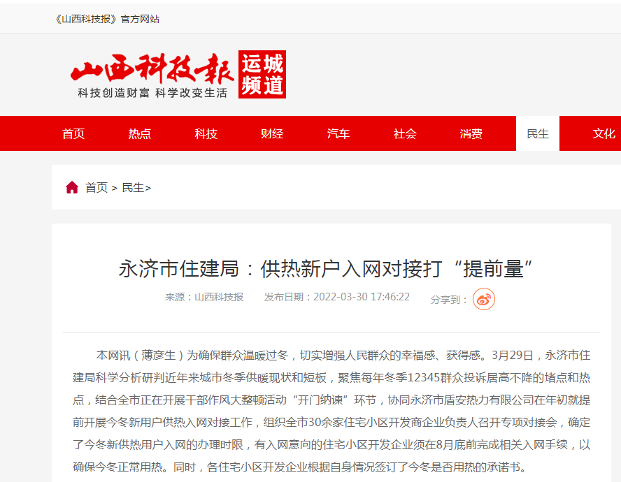 《山西科技報》點贊盾安永濟熱力公司 助力供熱新戶入網對接打“提前量”